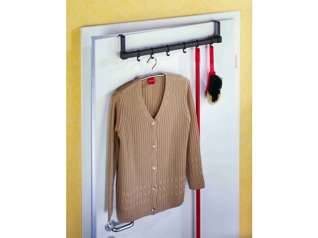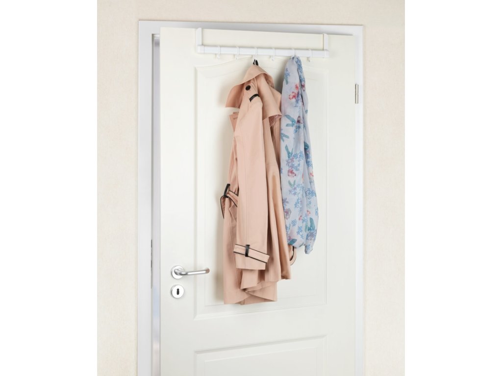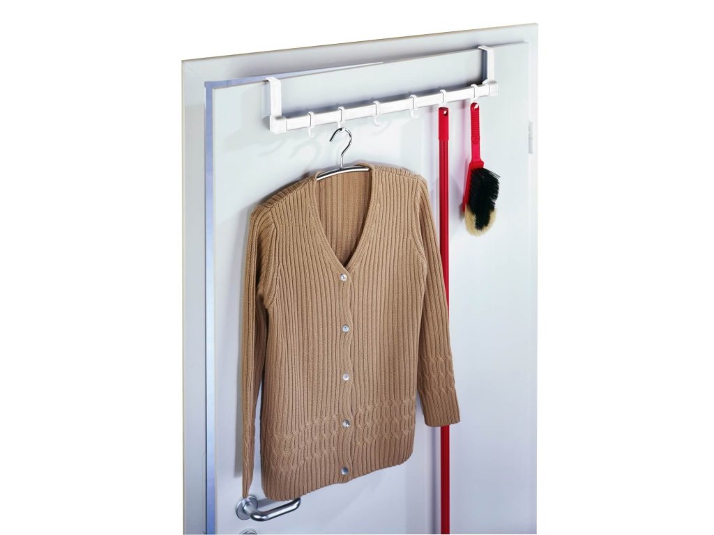 De zes haken bieden veelzijdige mogelijkheden voor het ophangen van jassen, blouses, handdoeken, badjassen, enz. De deurkapstok wordt eenvoudig aan de deur gehangen - schroeven of boren is niet nodig. Zelfs met de kleerhanger eraan sluit de deur gemakkelijk.
