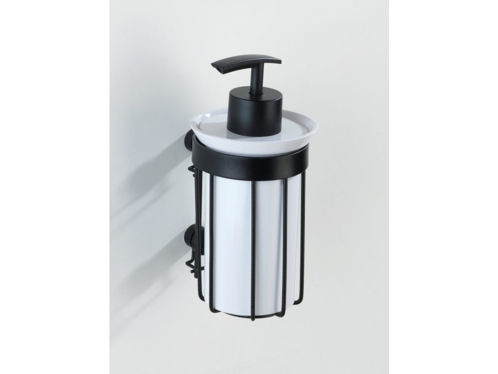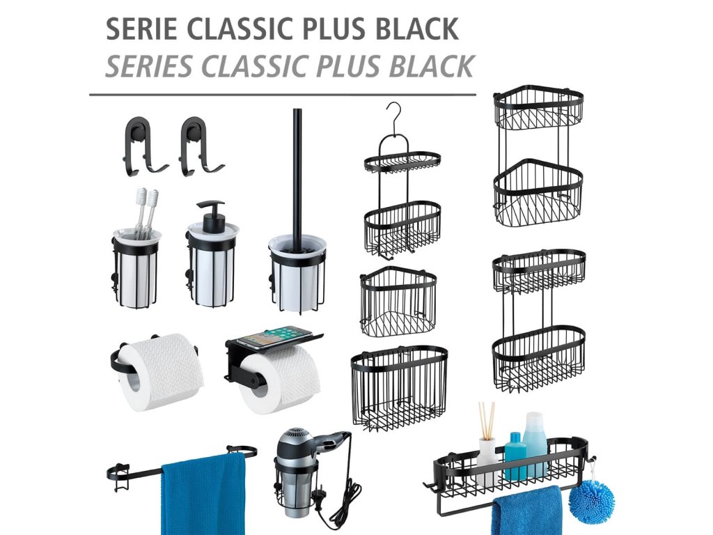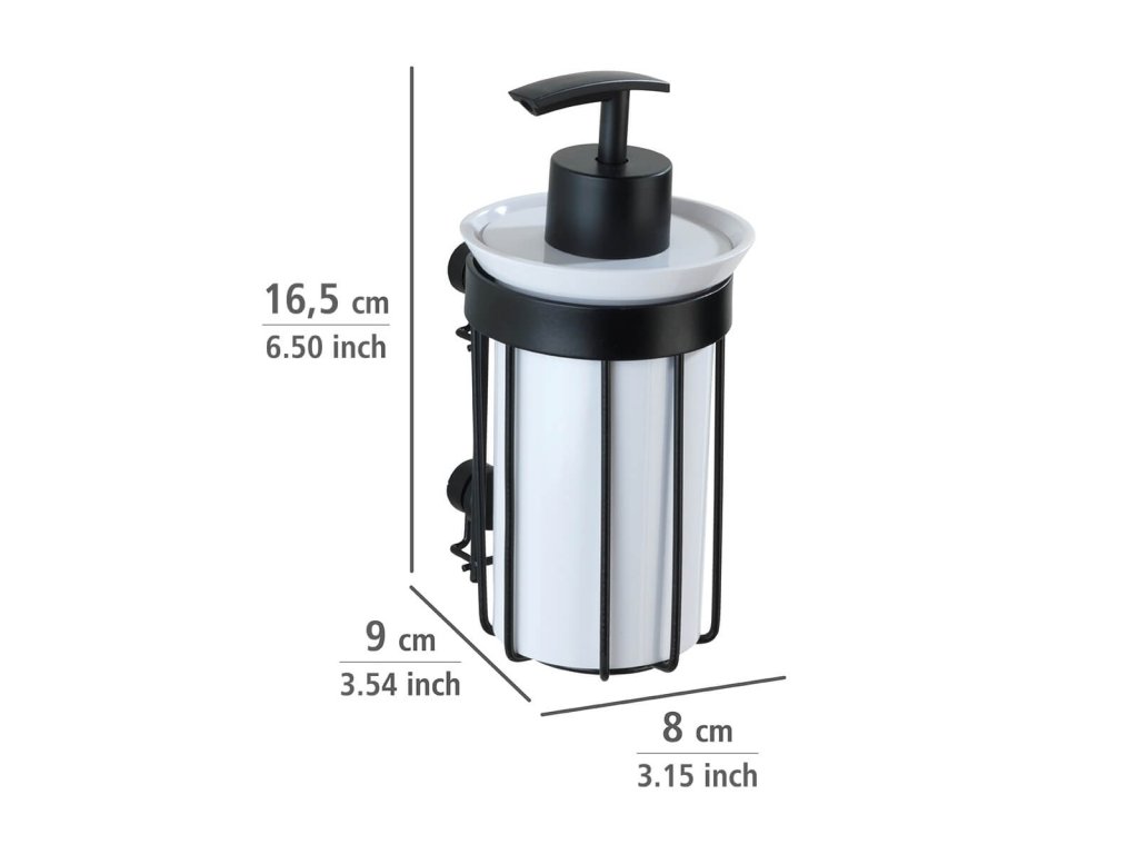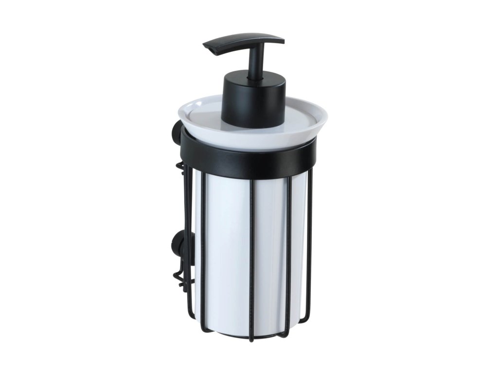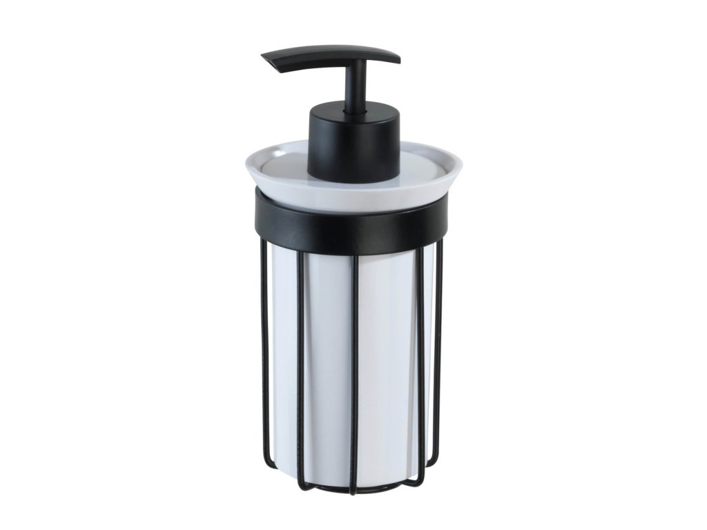 De navulbare zeepdispenser met pomp uit de Classic Plus Black badkamerserie heeft een inhoud van ca. 185 ml. De gewenste hoeveelheid vloeibare zeep of wascrème wordt gedoseerd door licht op de doseerkop te drukken. De afneembare witte kunststof dispenser is eenvoudig te reinigen. Een aantrekkelijk accessoire dat ook een mooi figuur slaat in de keuken, waar het kan worden gebruikt als afwasmiddeldispenser. Gewoon vullen met afwasmiddel en oude plastic flessen weggooien.