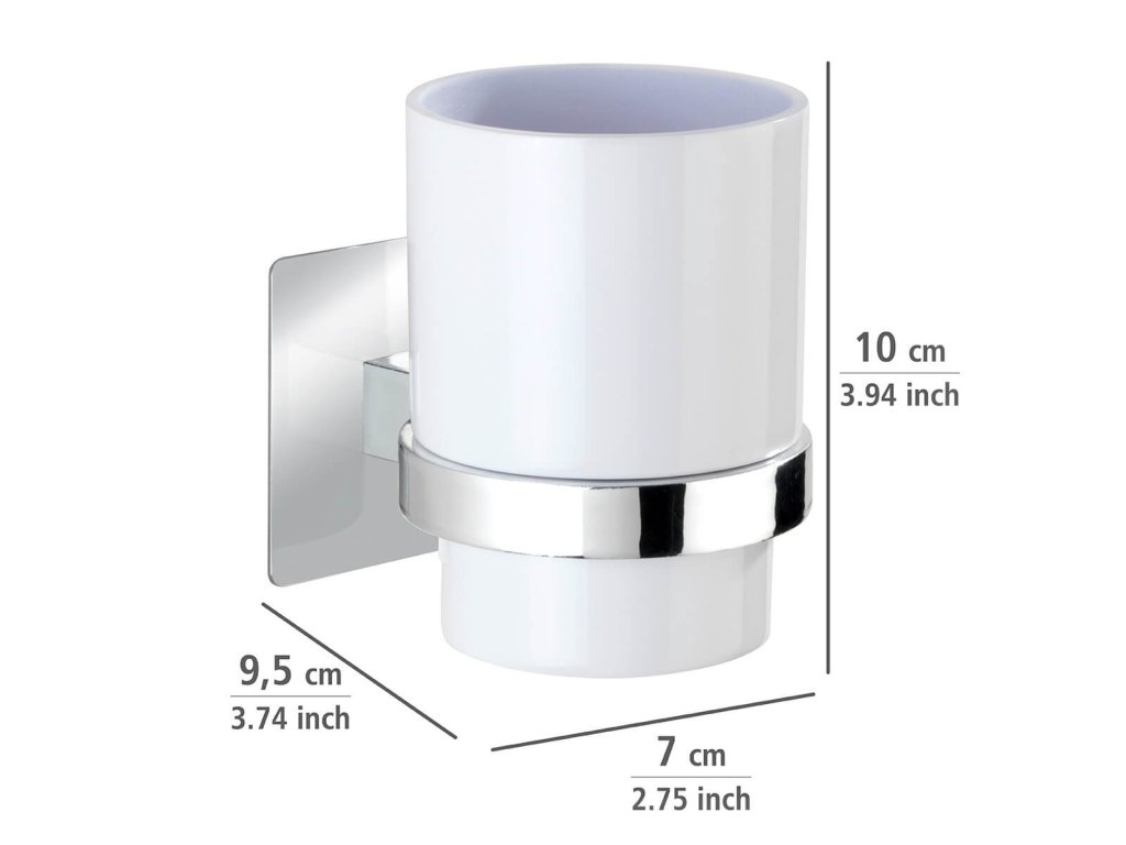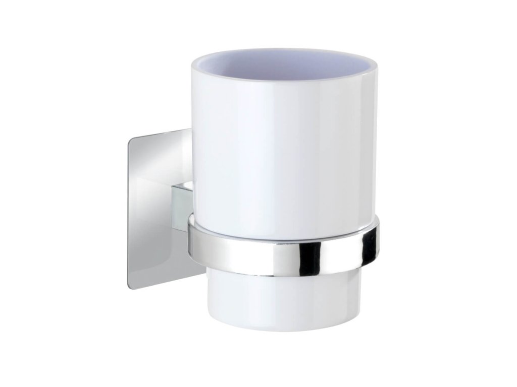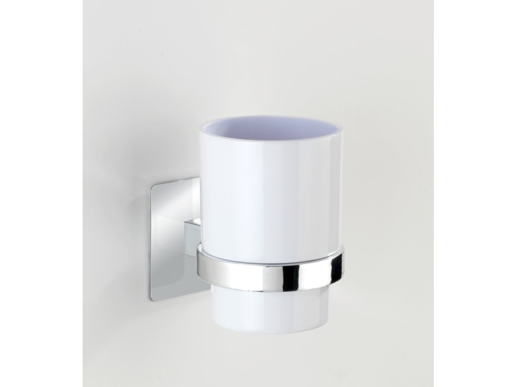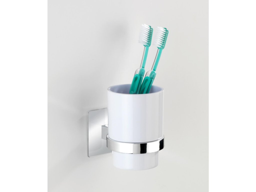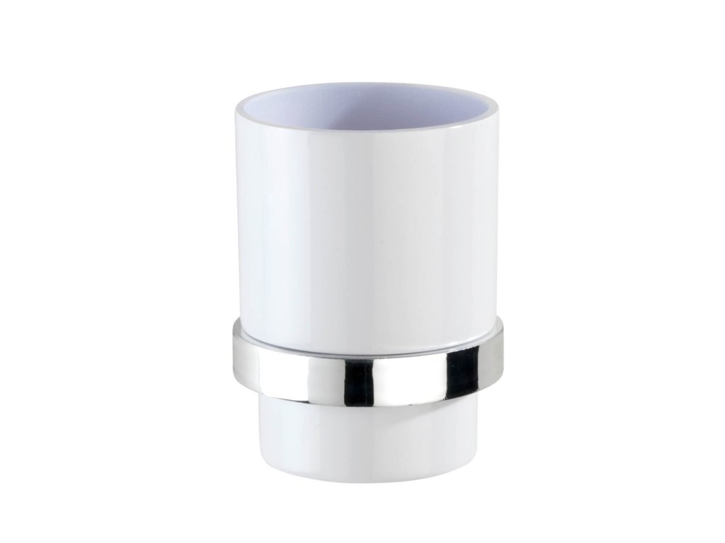 De elegante beker van wit kunststof in een roestvrijstalen houder is een uiterst aantrekkelijk designaccessoire. Een praktische oplossing voor het opbergen van mondhygiënehulpmiddelen.