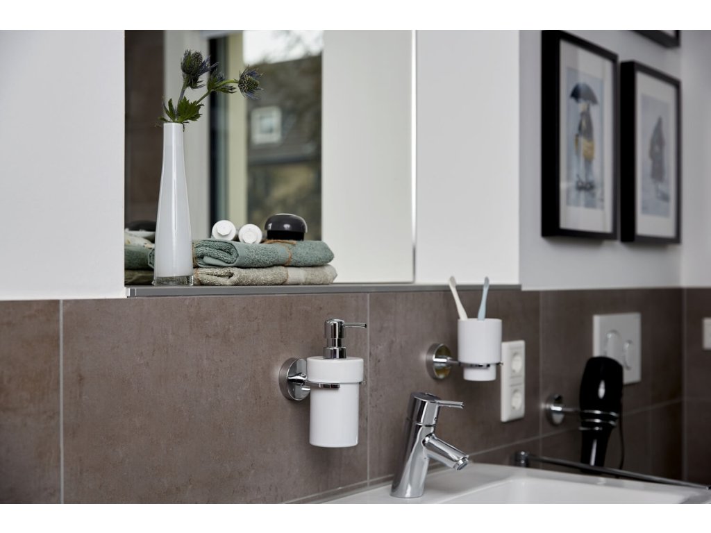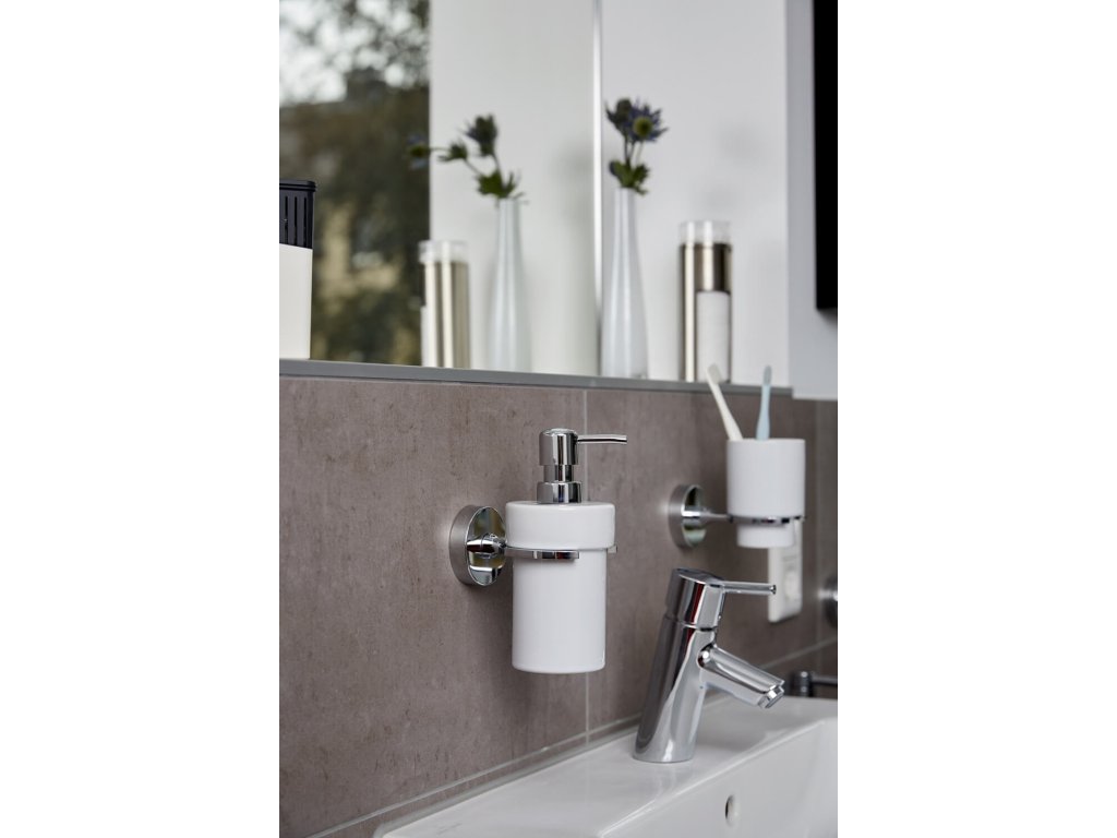 De fraai vormgegeven Vacuum-Loc® zeepdispenser uit de Capri-serie is afneembaar en gemaakt van wit keramiek. De zeepdispenserhouder is gemaakt van zwaar gegoten zink, dat verchroomd en corrosiebestendig is. De zeepdispenser kan op verschillende manieren worden gemonteerd